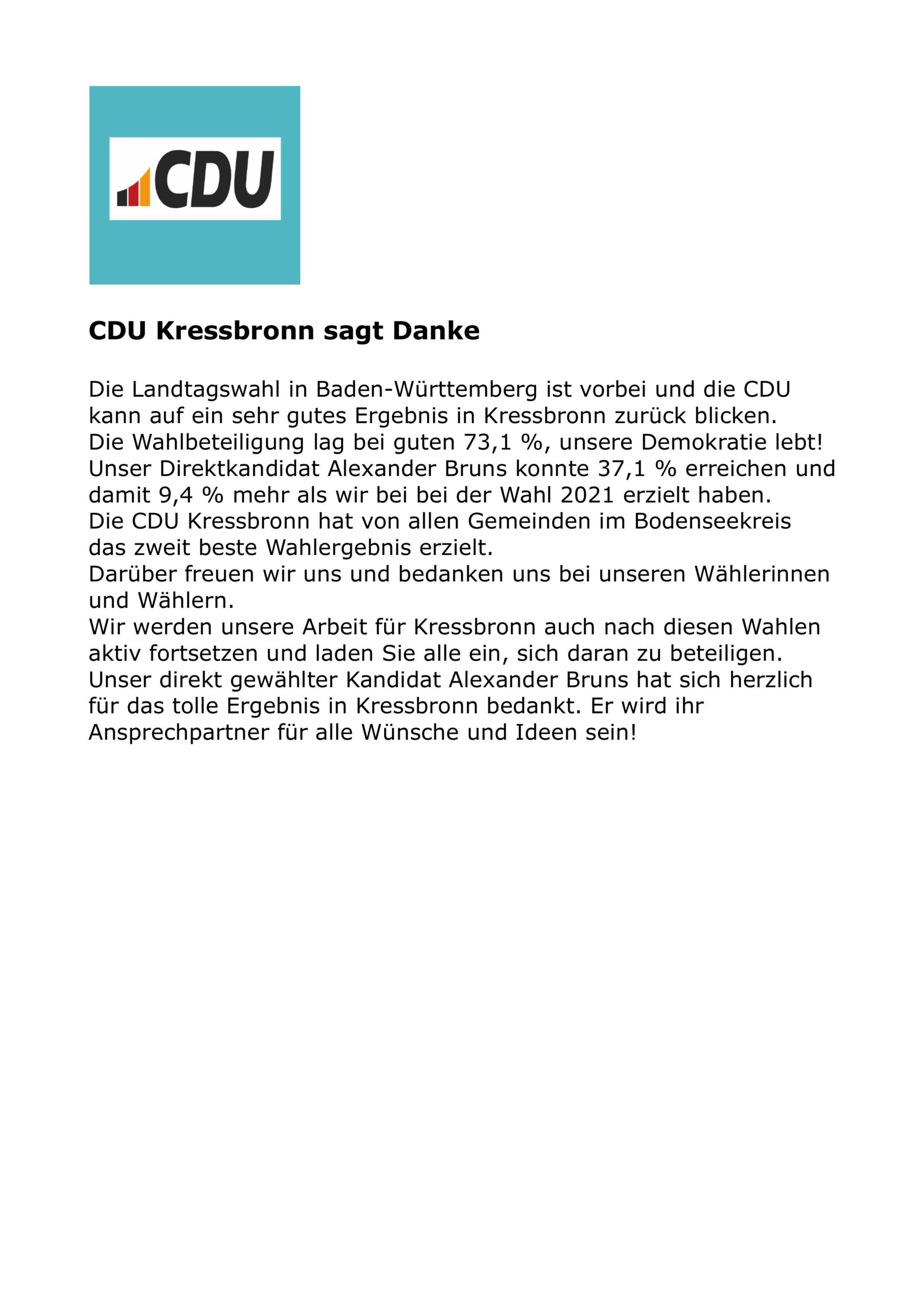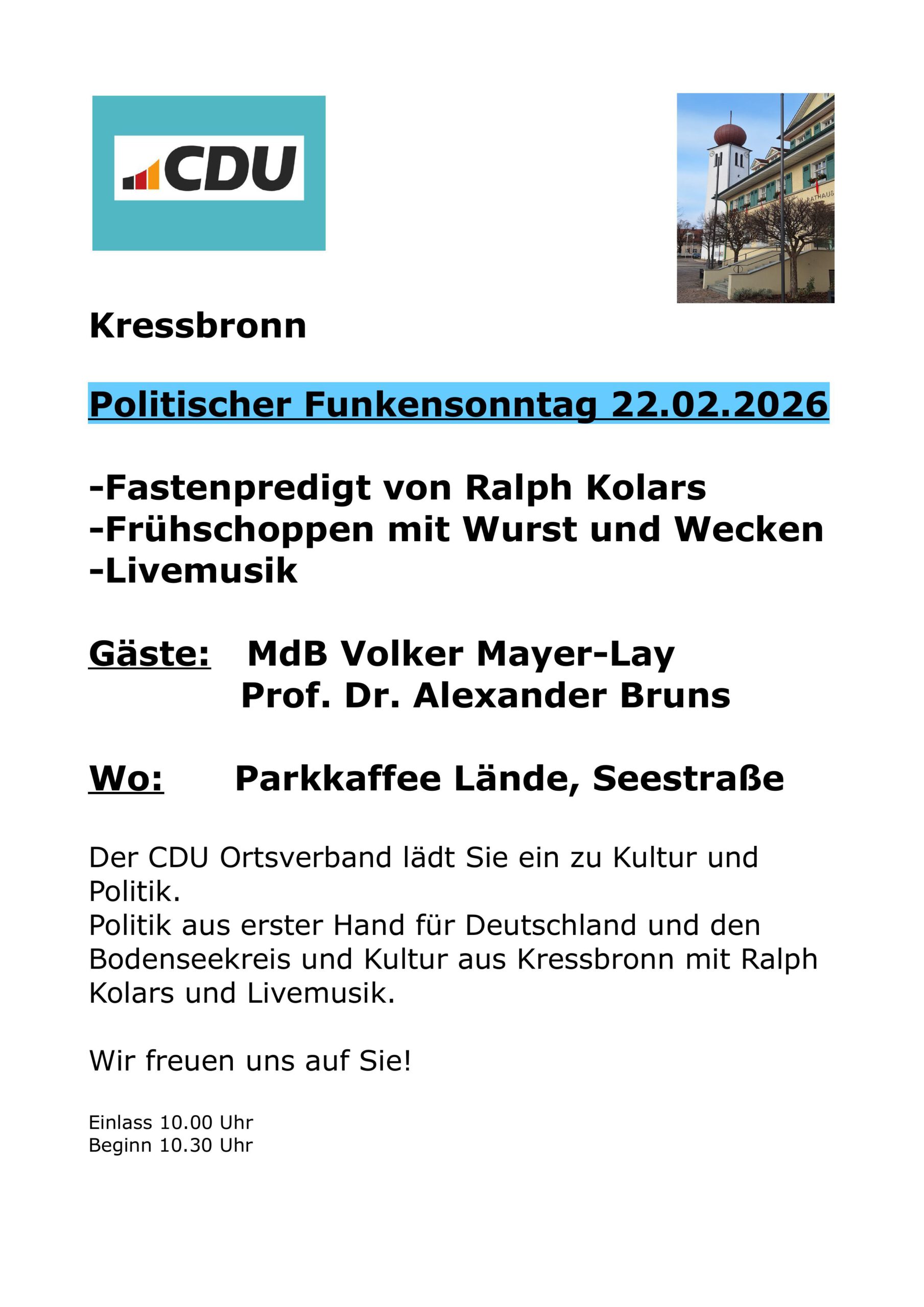 Auf unserer Website informieren wir Sie über unsere politische Arbeit in Kressbronn, unsere Ziele für die Gemeinde und die Menschen, die sich bei uns engagieren. Wir setzen uns ein für eine starke lokale Wirtschaft, bezahlbaren Wohnraum, ein lebendiges Vereinsleben und eine nachhaltige Entwicklung unserer Heimat. Als CDU stehen wir für Verlässlichkeit, Zusammenhalt und verantwortungsvolle Politik – nah am Bürger, klar in der Sache, offen im Dialog.